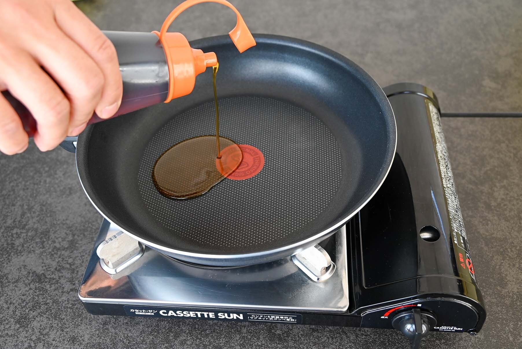 ① テフロンフライパンを加熱し